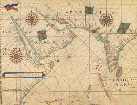 Portugals kontrol over det Indiske Ocean i 1560 markeret med grønne flag med røde kors.