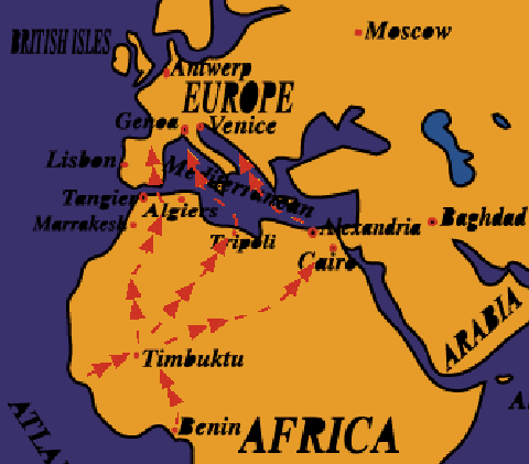 Kort over guldkaravaner i Afrika. Guldet transporteres fra Alexandria til Venedig.